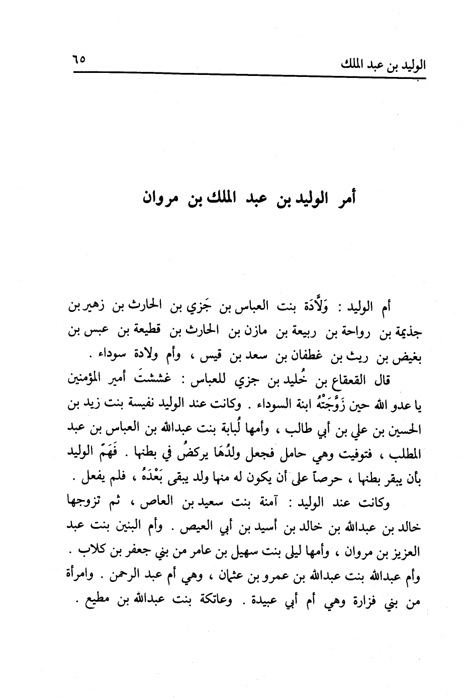 أم الوليد: ولادة بنت العباس بن جزي بْن الحارث بْن زُهَيْر بْن جذيمة بْن رواحة بْن ربيعة بْن مازن بْن الحارث بْن قطيعة بْن عبس بْن بغيض بْن رَيْث بْن غطفان بْن سَعْد بْن قيس، وأم ولادة سوداء.