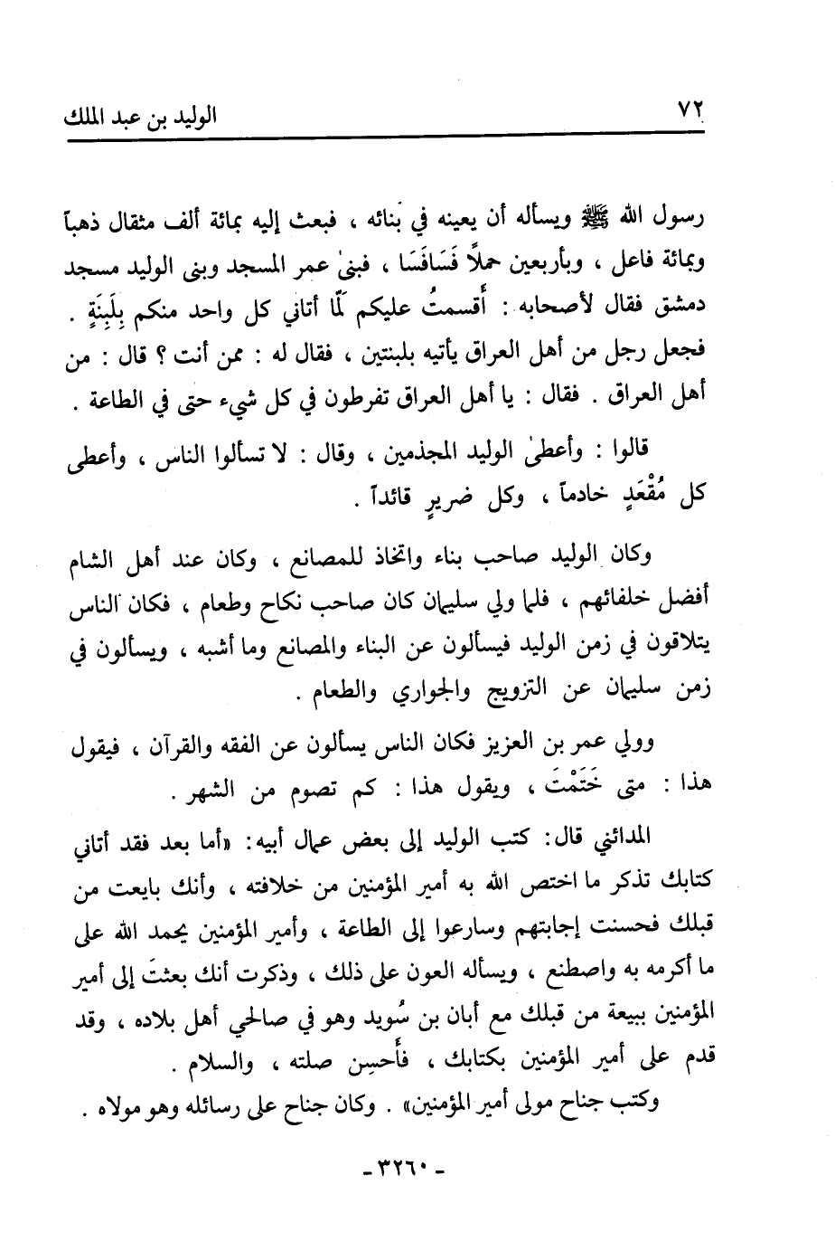 المدائني قال: كتب الوليد إلى بعض عمال أبيه: «أما بعد فقد أتاني كتابك تذكر ما أختص الله به أمير المؤمنين من خلافته، وأنك بايعت من قبلك فحسنت إجابتهم وسارعوا إلى الطاعة، وأمير المؤمنين يحمد الله على ما أكرمه به واصطنع، ويسأله العون على ذلك، وذكرت أنك بعثت إلى أمير المؤمنين ببيعة من قبلك مع أبان بن سويد وهو في صالحي أهل بلاده، وقد قدم على أمير المؤمنين بكتابك، فأحسن صلته، والسلام.