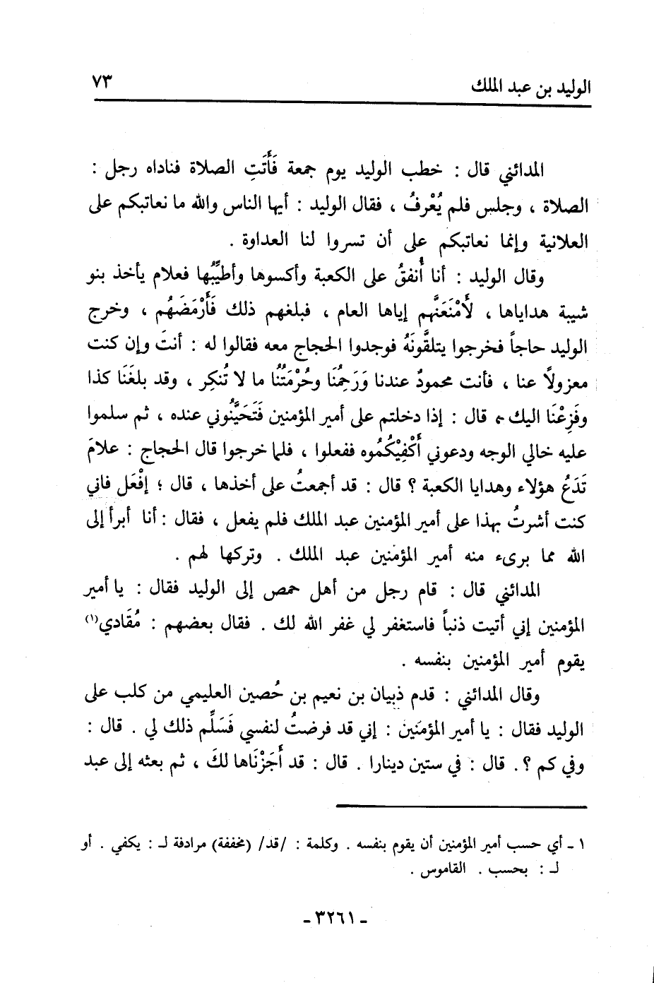 المدائني قال: قام رجل من أهل حمص إلى الوليد فقال: يا أمير المؤمنين إني أتيت ذنبا فاستغفر لي غفر الله لك. فقال بعضهم: مقادي [1] يقوم أمير المؤمنين بنفسه.