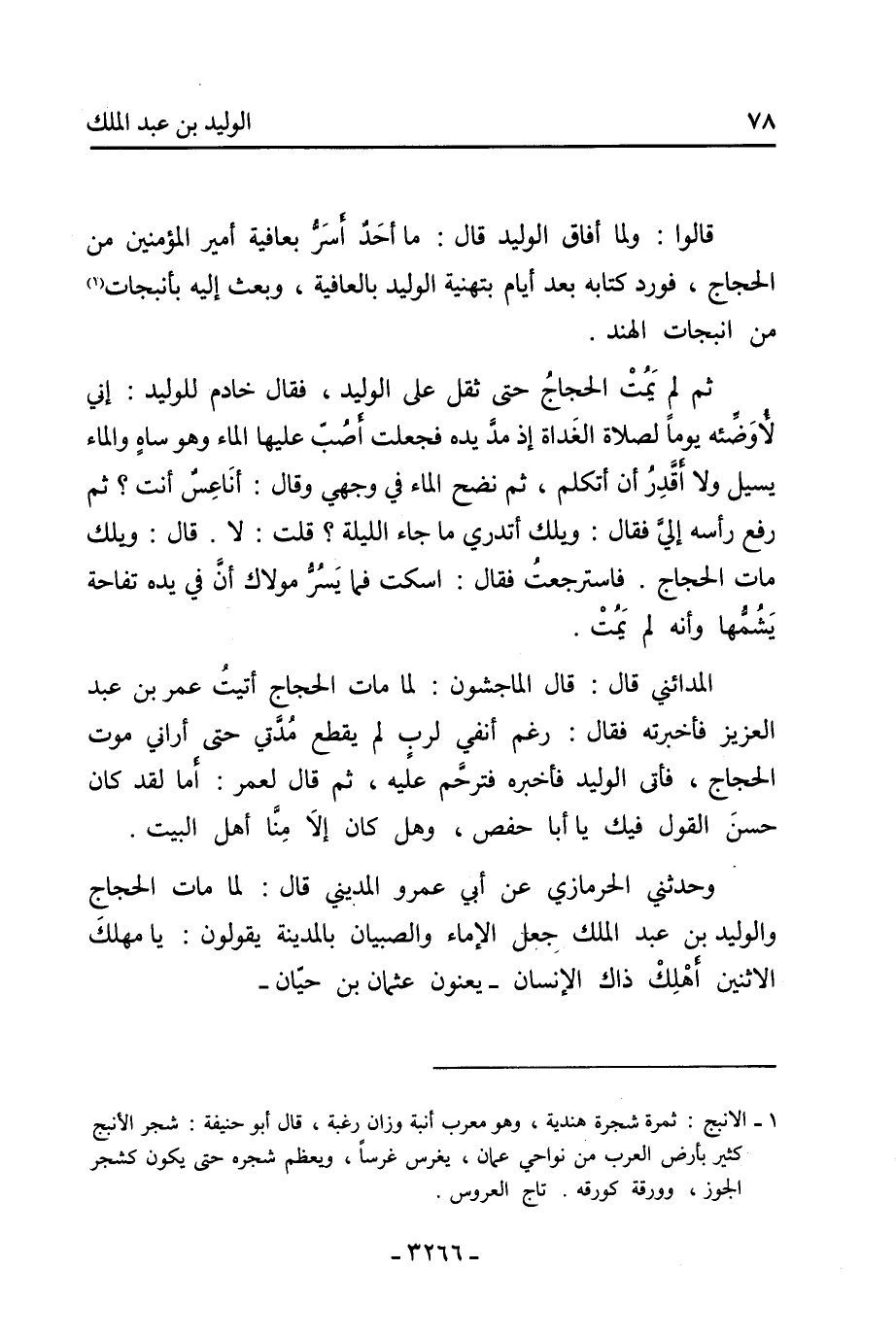 قالوا: ولما أفاق الوليد قال: ما أحد أسر بعافية أمير المؤمنين من الحجاج، فورد كتابه بعد أيام بتهنية الوليد بالعافية، وبعث إليه بأنبجات [1] من أنبجات الهند.