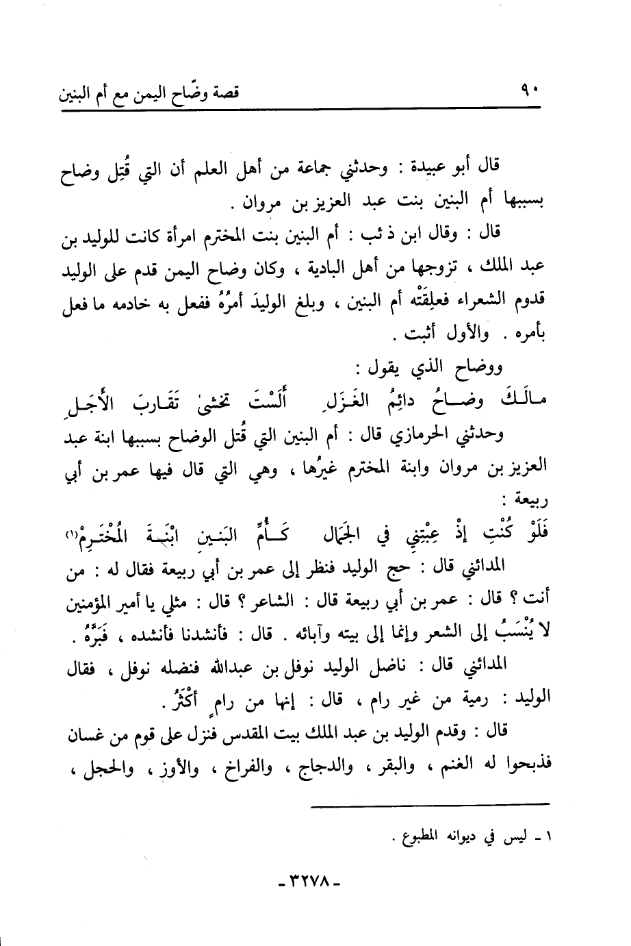 وحدثني الحرمازي قال: أم البنين التي قتل الوضاح بسببها ابنة عبد العزيز بن مروان وابنة المخترم غيرها، وهي التي قال فيها عمر بن أبي ربيعة: