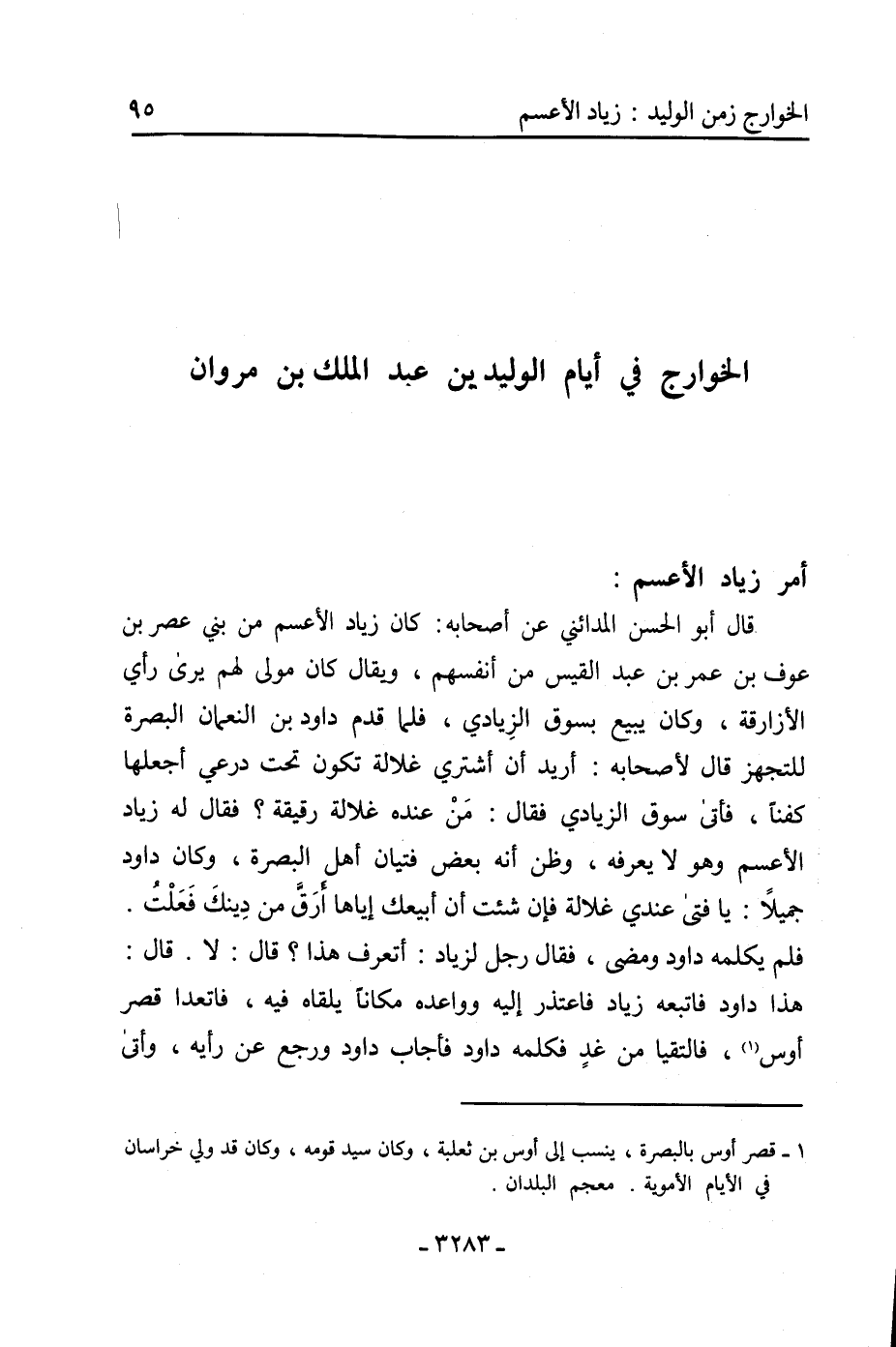 هذا داود فاتبعه زياد فاعتذر إليه وواعده مكانا يلقاه فيه، فاتعدا قصر أوس [1] ، فالتقيا من غد فكلمه داود فأجاب داود ورجع عن رأيه، وأتى