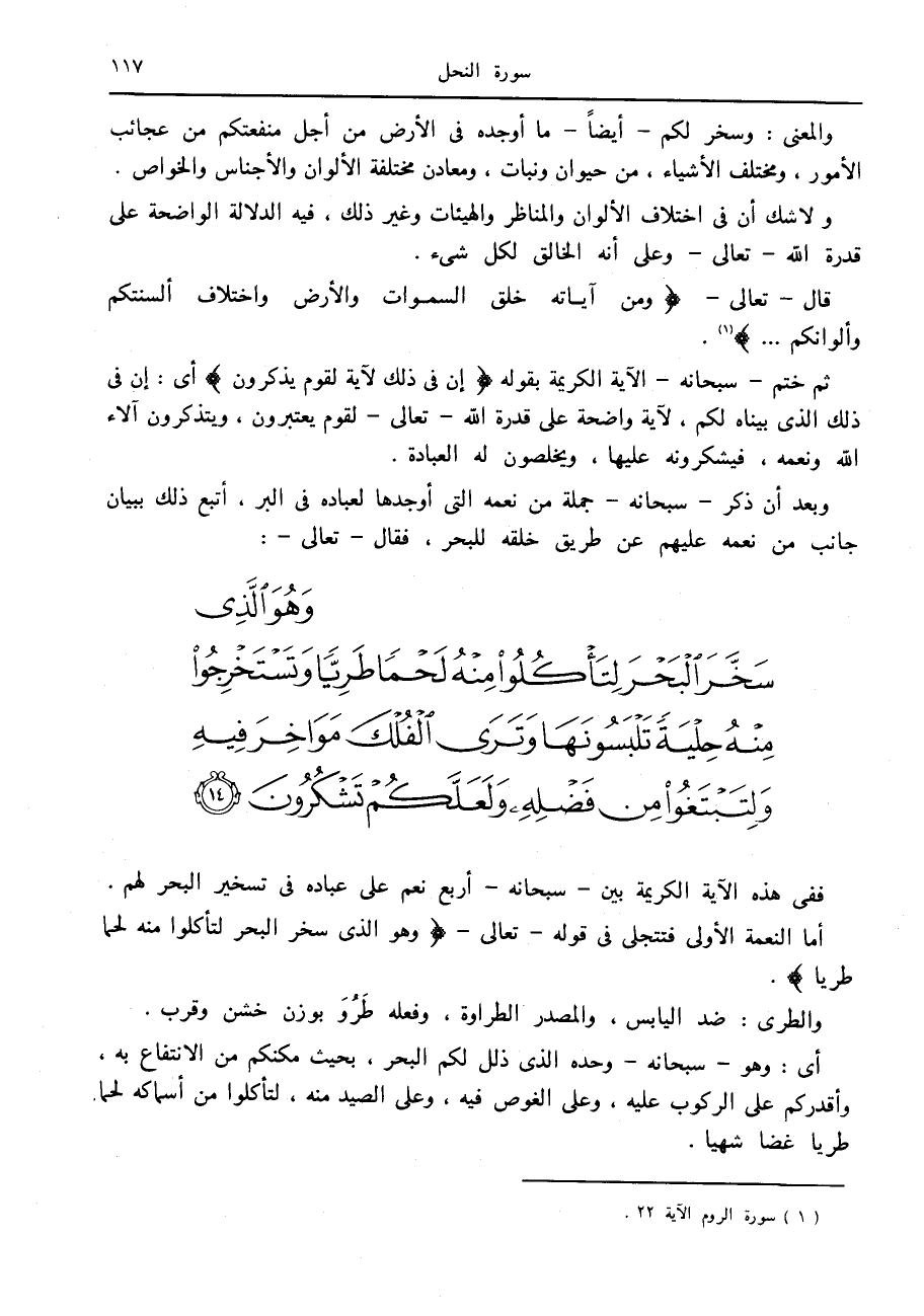 وَهُوَ الَّذِي سَخَّرَ الْبَحْرَ لِتَأْكُلُوا مِنْهُ لَحْماً طَرِيًّا وَتَسْتَخْرِجُوا مِنْهُ حِلْيَةً تَلْبَسُونَها وَتَرَى الْفُلْكَ مَواخِرَ فِيهِ وَلِتَبْتَغُوا مِنْ فَضْلِهِ وَلَعَلَّكُمْ تَشْكُرُونَ (14)