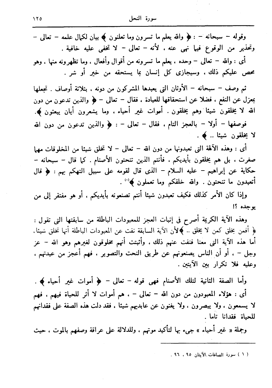 ثم وصف- سبحانه- الأوثان التي يعبدها المشركون من دونه، بثلاثة أوصاف. تجعلها بمعزل عن النفع، فضلا عن استحقاقها للعبادة، فقال- تعالى- وَالَّذِينَ يَدْعُونَ مِنْ دُونِ اللَّهِ لا يَخْلُقُونَ شَيْئاً وَهُمْ يُخْلَقُونَ. أَمْواتٌ غَيْرُ أَحْياءٍ، وَما يَشْعُرُونَ أَيَّانَ يُبْعَثُونَ.