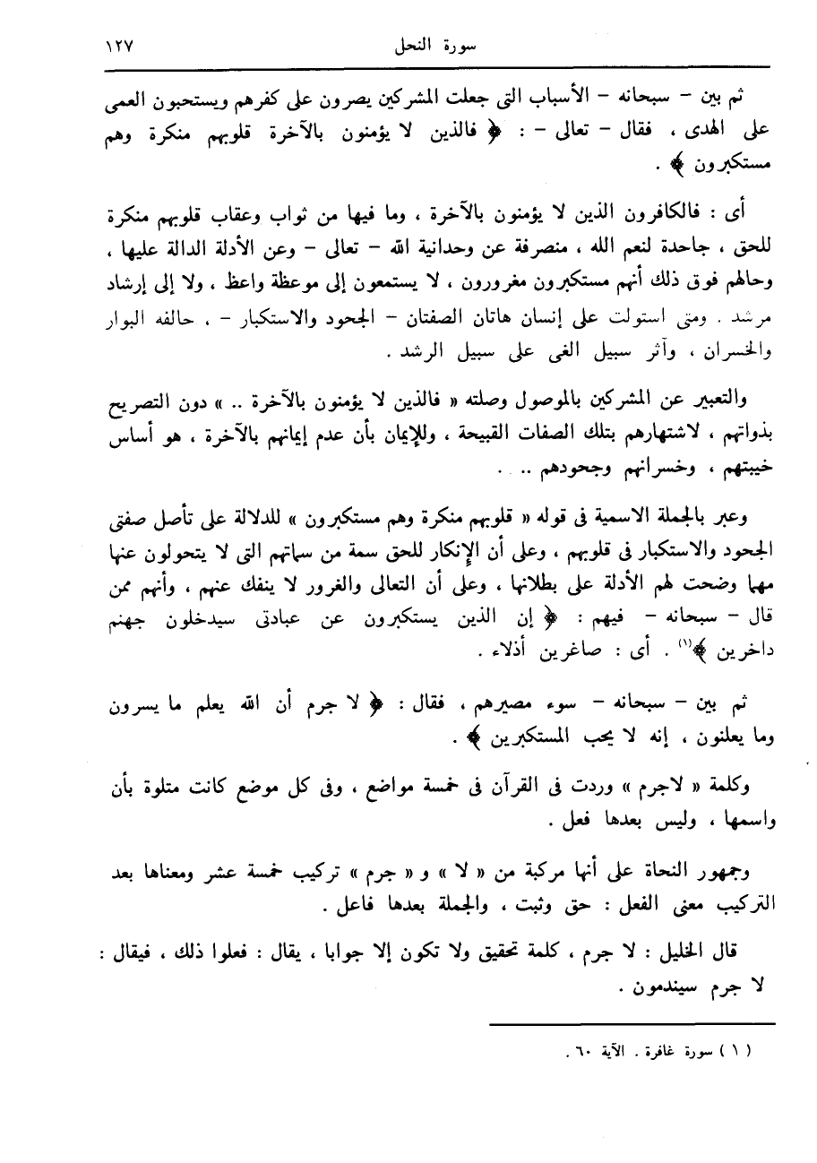 وعبر بالجملة الاسمية في قوله «قلوبهم منكرة وهم مستكبرون» للدلالة على تأصل صفتي الجحود والاستكبار في قلوبهم، وعلى أن الإنكار للحق سمة من سماتهم التي لا يتحولون عنها مهما وضحت لهم الأدلة على بطلانها، وعلى أن التعالي والغرور لا ينفك عنهم، وأنهم ممن قال- سبحانه- فيهم: إِنَّ الَّذِينَ يَسْتَكْبِرُونَ عَنْ عِبادَتِي سَيَدْخُلُونَ جَهَنَّمَ داخِرِينَ «1» . أى: صاغرين أذلاء.
