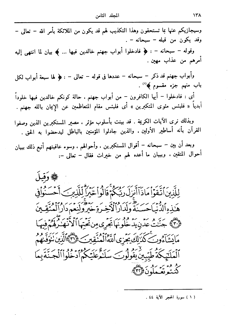 وبعد أن بين- سبحانه- أقوال المستكبرين، وأحوالهم، وسوء عاقبتهم أتبع ذلك ببيان أحوال المتقين، وببيان ما أعده لهم من خيرات فقال- تعالى-: