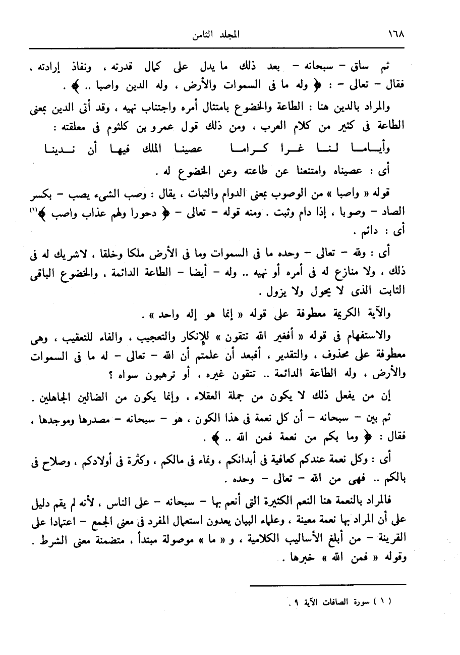 ثم ساق- سبحانه- بعد ذلك ما يدل على كمال قدرته، ونفاذ إرادته، فقال- تعالى-: وَلَهُ ما فِي السَّماواتِ وَالْأَرْضِ، وَلَهُ الدِّينُ واصِباً ...