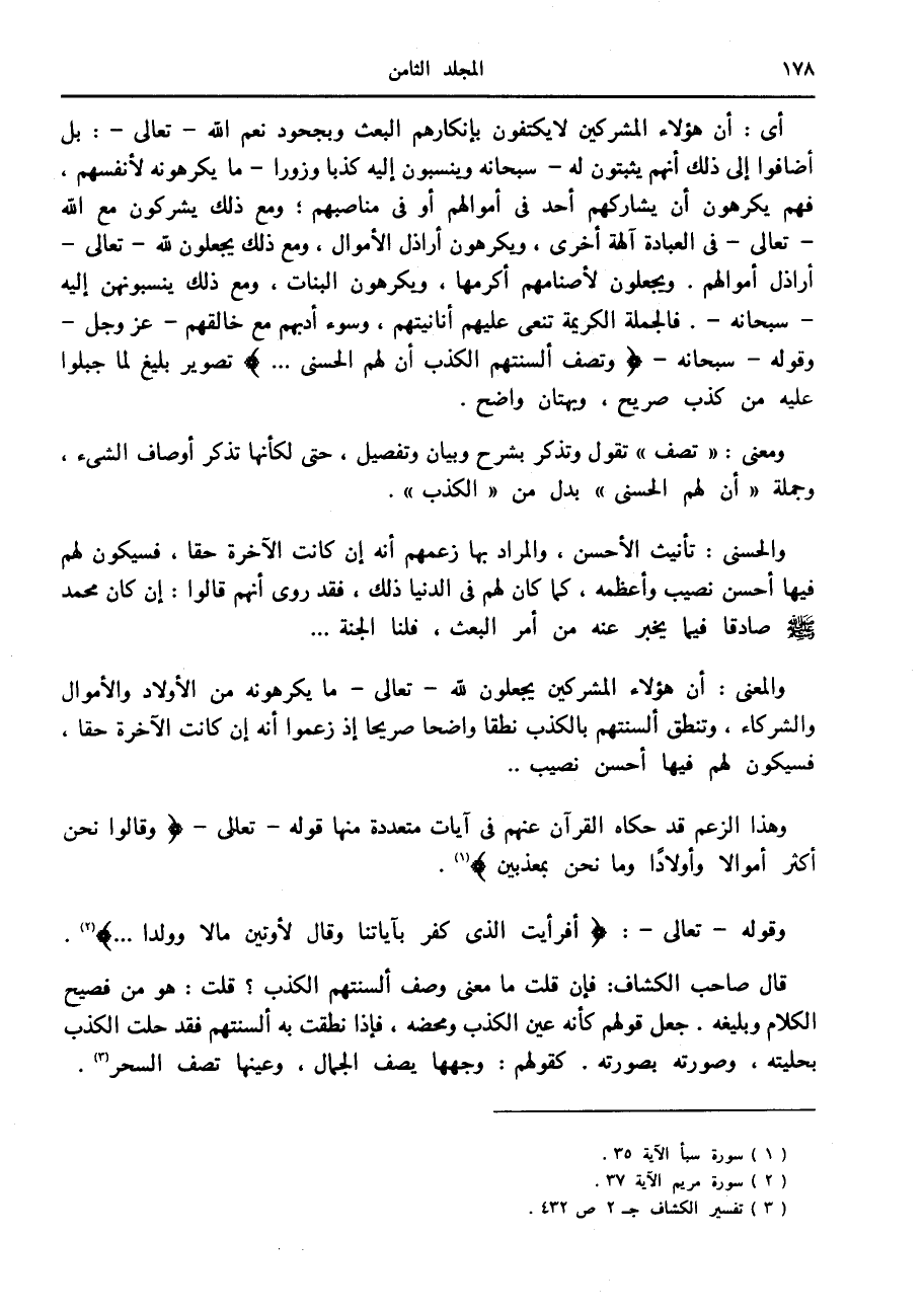 وقوله- تعالى-: أَفَرَأَيْتَ الَّذِي كَفَرَ بِآياتِنا وَقالَ لَأُوتَيَنَّ مالًا وَوَلَداً ... «2» .