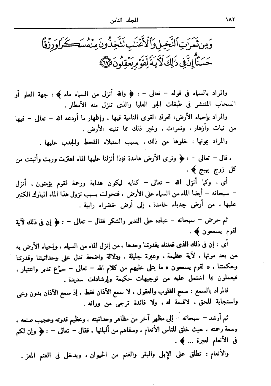ثم أرشد- سبحانه- إلى مظهر آخر من مظاهر وحدانيته، وعظيم قدرته وعجيب صنعه، وسعة رحمته، حيث خلق للناس الأنعام، وسقاهم من ألبانها، فقال- تعالى-: وَإِنَّ لَكُمْ فِي الْأَنْعامِ لَعِبْرَةً....