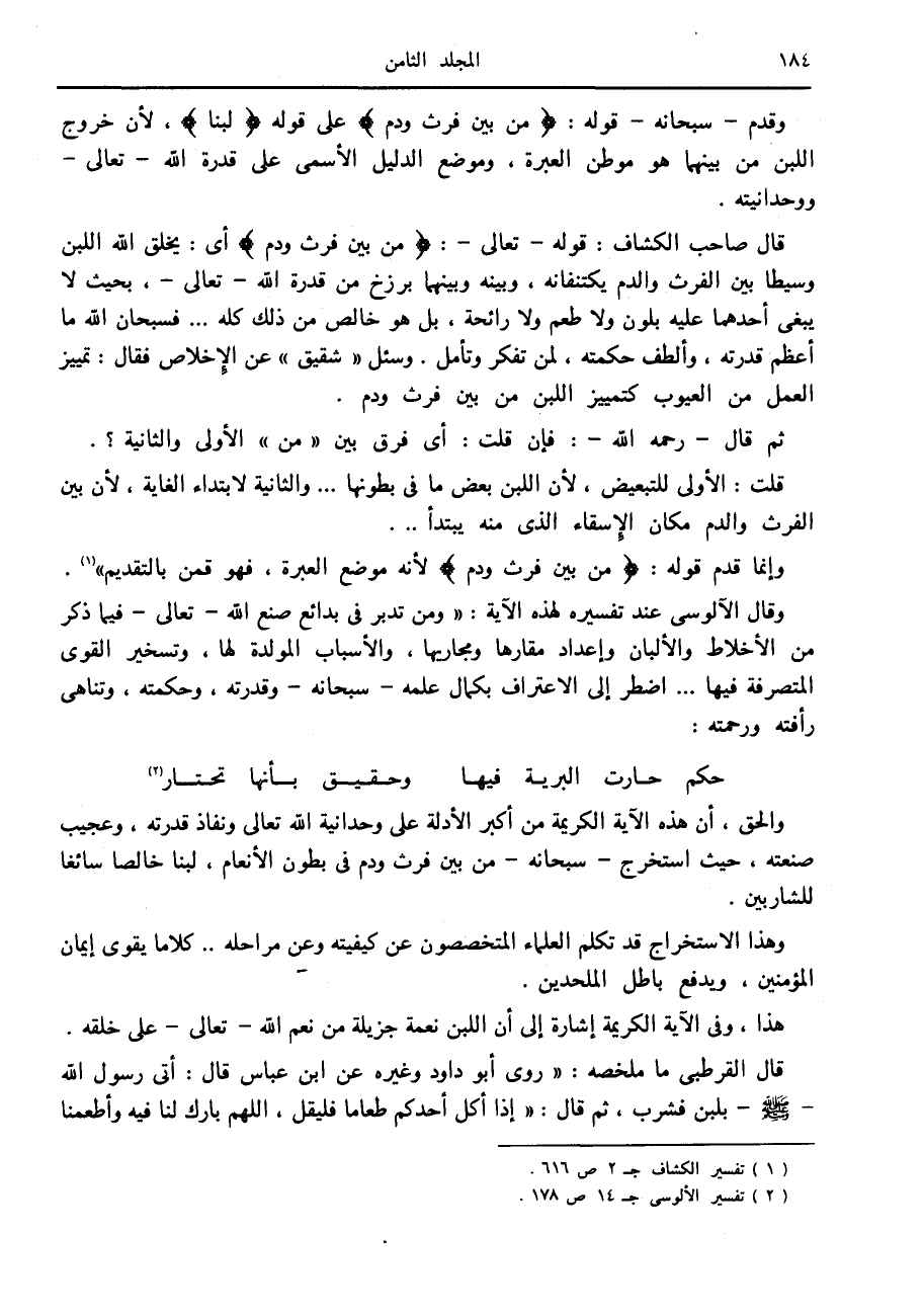 وقال الآلوسى عند تفسيره لهذه الآية: «ومن تدبر في بدائع صنع الله- تعالى- فيما ذكر من الأخلاط والألبان وإعداد مقارها ومجاريها، والأسباب المولدة لها، وتسخير القوى المتصرفة فيها ... اضطر إلى الاعتراف بكمال علمه- سبحانه- وقدرته، وحكمته، وتناهى رأفته ورحمته: