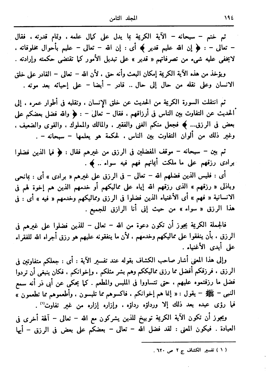 وإلى هذا المعنى أشار صاحب الكشاف بقوله عند تفسير الآية: أى: جعلكم متفاوتين في الرزق، فرزقكم أفضل مما رزق مماليككم وهم بشر مثلكم، وإخوانكم، فكان ينبغي أن تردوا فضل ما رزقتموه عليهم، حتى تتساووا في الملبس والمطعم. كما يحكى عن أبى ذر أنه سمع النبي صلى الله عليه وسلم يقول: «إنما هم إخوانكم، فاكسوهم مما تلبسون، وأطعموهم مما تطعمون» فما رؤي عبده بعد ذلك إلا ورداؤه رداؤه، وإزاره إزاره من غير تفاوت «1» .