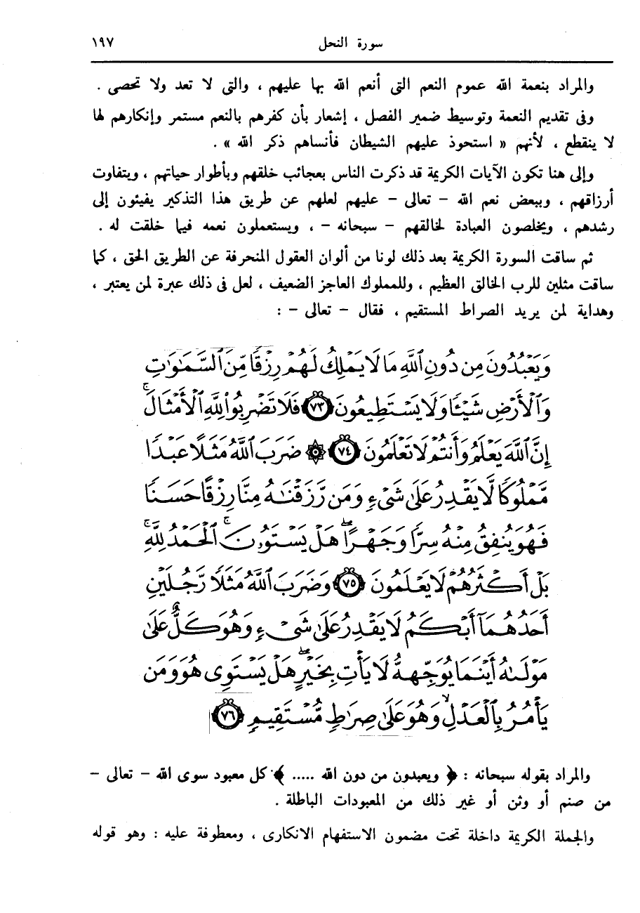 وَيَعْبُدُونَ مِنْ دُونِ اللَّهِ ما لا يَمْلِكُ لَهُمْ رِزْقاً مِنَ السَّماواتِ وَالْأَرْضِ شَيْئاً وَلا يَسْتَطِيعُونَ (73) فَلا تَضْرِبُوا لِلَّهِ الْأَمْثالَ إِنَّ اللَّهَ يَعْلَمُ وَأَنْتُمْ لا تَعْلَمُونَ (74) ضَرَبَ اللَّهُ مَثَلاً عَبْداً مَمْلُوكاً لا يَقْدِرُ عَلى شَيْءٍ وَمَنْ رَزَقْناهُ مِنَّا رِزْقاً حَسَناً فَهُوَ يُنْفِقُ مِنْهُ سِرًّا وَجَهْراً هَلْ يَسْتَوُونَ الْحَمْدُ لِلَّهِ بَلْ أَكْثَرُهُمْ لا يَعْلَمُونَ (75) وَضَرَبَ اللَّهُ مَثَلاً رَجُلَيْنِ أَحَدُهُما أَبْكَمُ لا يَقْدِرُ عَلى شَيْءٍ وَهُوَ كَلٌّ عَلى مَوْلاهُ أَيْنَما يُوَجِّهْهُ لا يَأْتِ بِخَيْرٍ هَلْ يَسْتَوِي هُوَ وَمَنْ يَأْمُرُ بِالْعَدْلِ وَهُوَ عَلى صِراطٍ مُسْتَقِيمٍ (76)