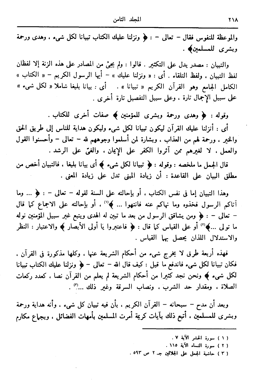 والموعظة للنفوس فقال- تعالى-: وَنَزَّلْنا عَلَيْكَ الْكِتابَ تِبْياناً لِكُلِّ شَيْءٍ، وَهُدىً وَرَحْمَةً وَبُشْرى لِلْمُسْلِمِينَ.