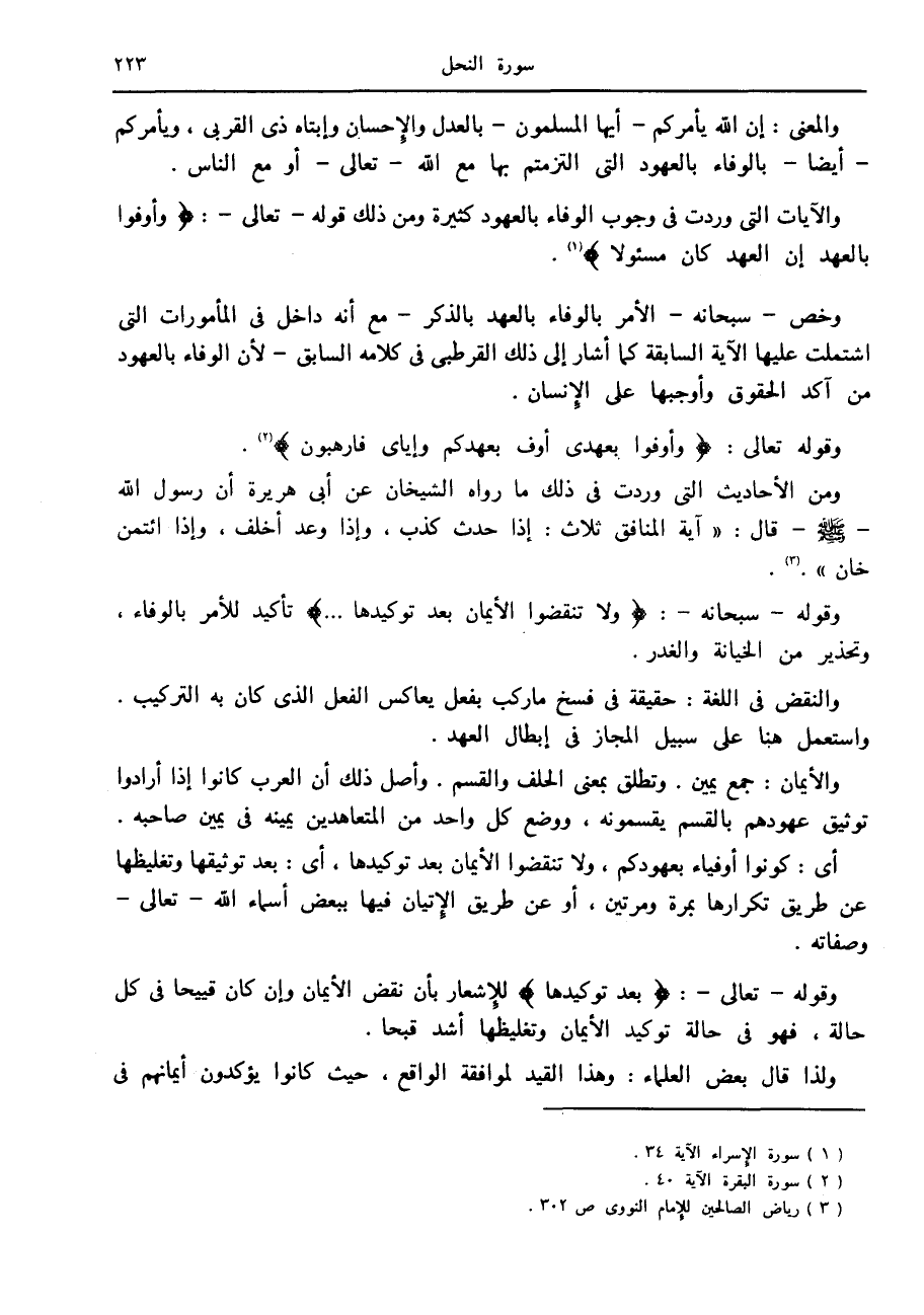 والآيات التي وردت في وجوب الوفاء بالعهود كثيرة ومن ذلك قوله- تعالى-: وَأَوْفُوا بِالْعَهْدِ إِنَّ الْعَهْدَ كانَ مَسْؤُلًا «1» .