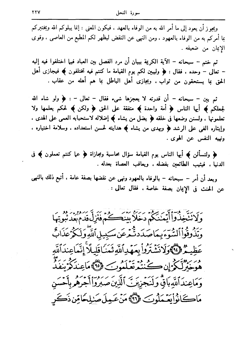 وبعد أن أمر- سبحانه- بالوفاء بالعهود ونهى عن نقضها بصفة عامة، أتبع ذلك بالنهى عن الحنث في الإيمان بصفة خاصة، فقال تعالى: