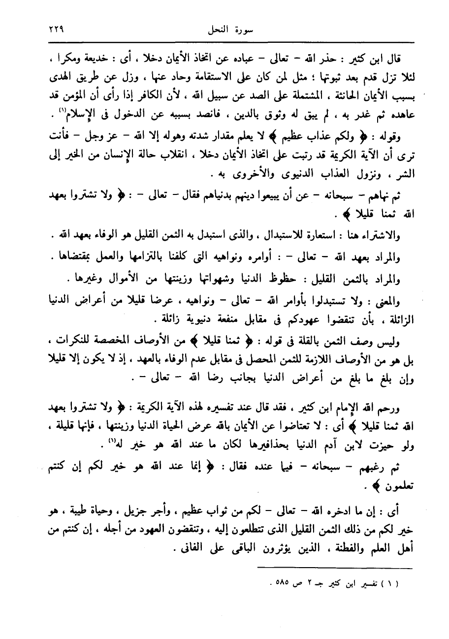 ورحم الله الإمام ابن كثير، فقد قال عند تفسيره لهذه الآية الكريمة: وَلا تَشْتَرُوا بِعَهْدِ اللَّهِ ثَمَناً قَلِيلًا أى: لا تعتاضوا عن الأيمان بالله عرض الحياة الدنيا وزينتها، فإنها قليلة، ولو حيزت لابن آدم الدنيا بحذافيرها لكان ما عند الله هو خير له «2» .