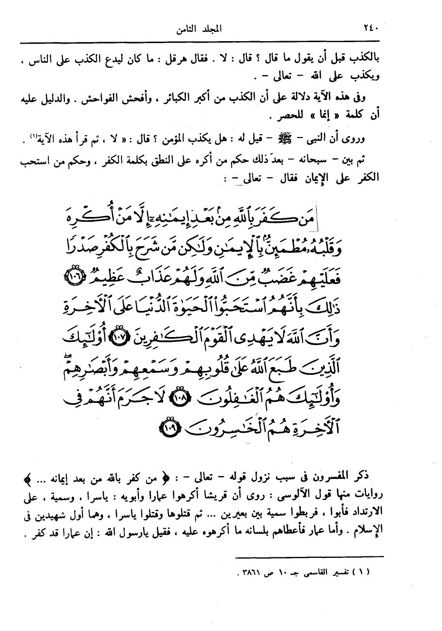 مَنْ كَفَرَ بِاللَّهِ مِنْ بَعْدِ إِيمانِهِ إِلاَّ مَنْ أُكْرِهَ وَقَلْبُهُ مُطْمَئِنٌّ بِالْإِيمانِ وَلكِنْ مَنْ شَرَحَ بِالْكُفْرِ صَدْراً فَعَلَيْهِمْ غَضَبٌ مِنَ اللَّهِ وَلَهُمْ عَذابٌ عَظِيمٌ (106) ذلِكَ بِأَنَّهُمُ اسْتَحَبُّوا الْحَياةَ الدُّنْيا عَلَى الْآخِرَةِ وَأَنَّ اللَّهَ لا يَهْدِي الْقَوْمَ الْكافِرِينَ (107) أُولئِكَ الَّذِينَ طَبَعَ اللَّهُ عَلى قُلُوبِهِمْ وَسَمْعِهِمْ وَأَبْصارِهِمْ وَأُولئِكَ هُمُ الْغافِلُونَ (108) لا جَرَمَ أَنَّهُمْ فِي الْآخِرَةِ هُمُ الْخاسِرُونَ (109)