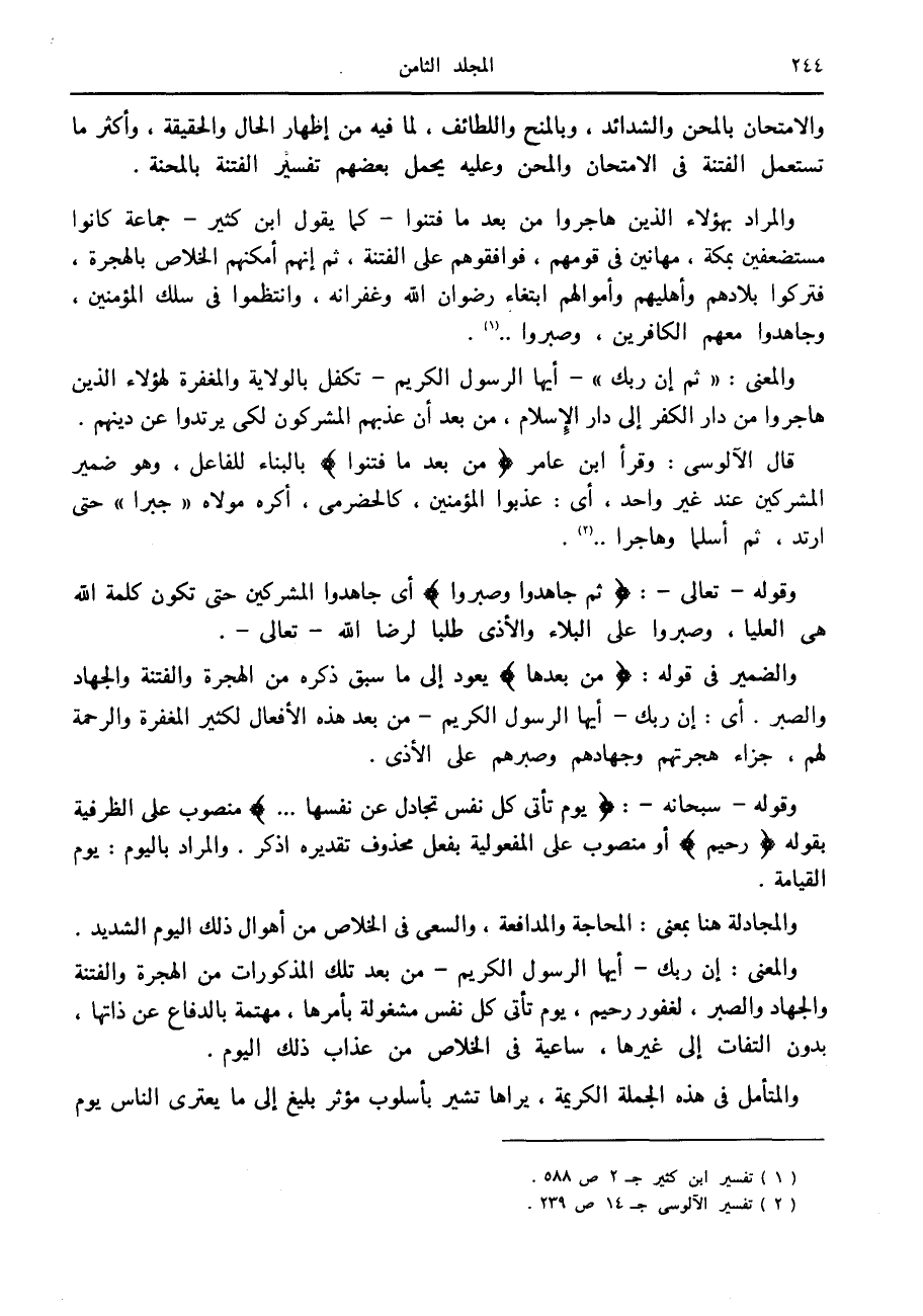 والمعنى: إن ربك- أيها الرسول الكريم- من بعد تلك المذكورات من الهجرة والفتنة والجهاد والصبر، لغفور رحيم، يوم تأتى كل نفس مشغولة بأمرها، مهتمة بالدفاع عن ذاتها، بدون التفات إلى غيرها، ساعية في الخلاص من عذاب ذلك اليوم.