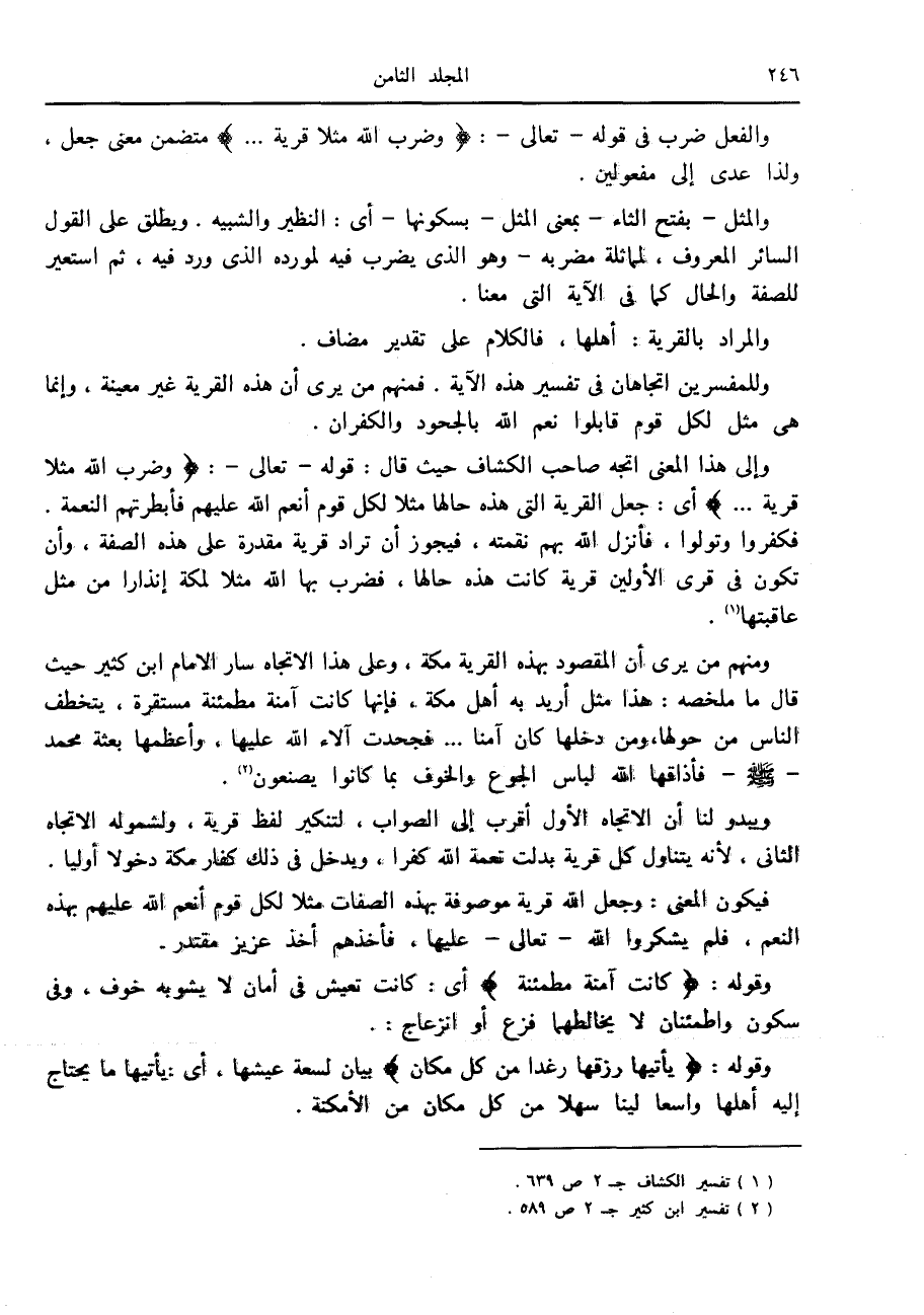 ومنهم من يرى أن المقصود بهذه القرية مكة، وعلى هذا الاتجاه سار الامام ابن كثير حيث قال ما ملخصه: هذا مثل أريد به أهل مكة، فإنها كانت آمنة مطمئنة مستقرة، يتخطف الناس من حولها، ومن دخلها كان آمنا ... فجحدت آلاء الله عليها، وأعظمها بعثة محمد صلى الله عليه وسلم فأذاقها الله لباس الجوع والخوف بما كانوا يصنعون «2» .