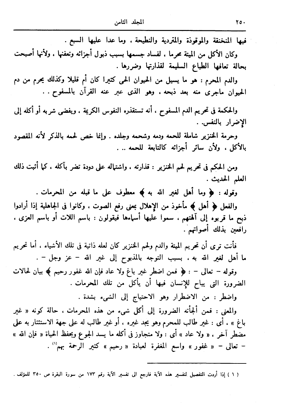 (1) إذا أردت التفصيل لتفسير هذه الآية فارجع الى تفسير الآية رقم 173 من سورة البقرة ص 350 للمؤلف.