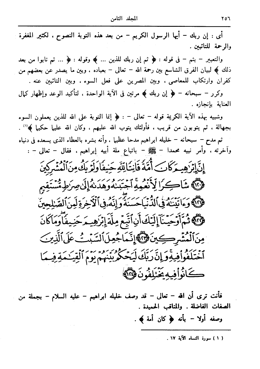 إِنَّ إِبْراهِيمَ كانَ أُمَّةً قانِتاً لِلَّهِ حَنِيفاً وَلَمْ يَكُ مِنَ الْمُشْرِكِينَ (120) شاكِراً لِأَنْعُمِهِ اجْتَباهُ وَهَداهُ إِلى صِراطٍ مُسْتَقِيمٍ (121) وَآتَيْناهُ فِي الدُّنْيا حَسَنَةً وَإِنَّهُ فِي الْآخِرَةِ لَمِنَ الصَّالِحِينَ (122) ثُمَّ أَوْحَيْنا إِلَيْكَ أَنِ اتَّبِعْ مِلَّةَ إِبْراهِيمَ حَنِيفاً وَما كانَ مِنَ الْمُشْرِكِينَ (123) إِنَّما جُعِلَ السَّبْتُ عَلَى الَّذِينَ اخْتَلَفُوا فِيهِ وَإِنَّ رَبَّكَ لَيَحْكُمُ بَيْنَهُمْ يَوْمَ الْقِيامَةِ فِيما كانُوا فِيهِ يَخْتَلِفُونَ (124)