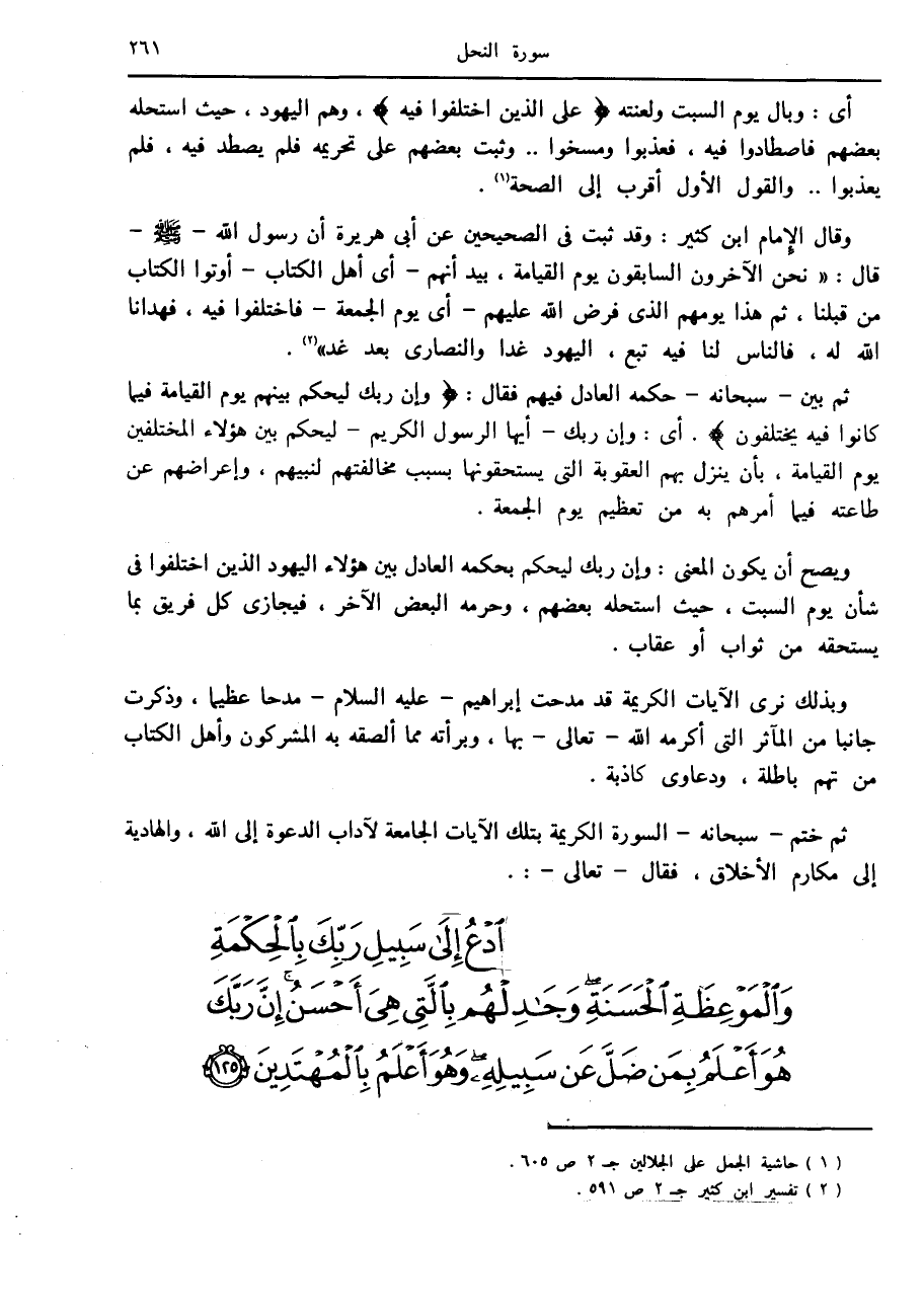 ثم ختم- سبحانه- السورة الكريمة بتلك الآيات الجامعة لآداب الدعوة إلى الله، والهادية إلى مكارم الأخلاق، فقال- تعالى-: