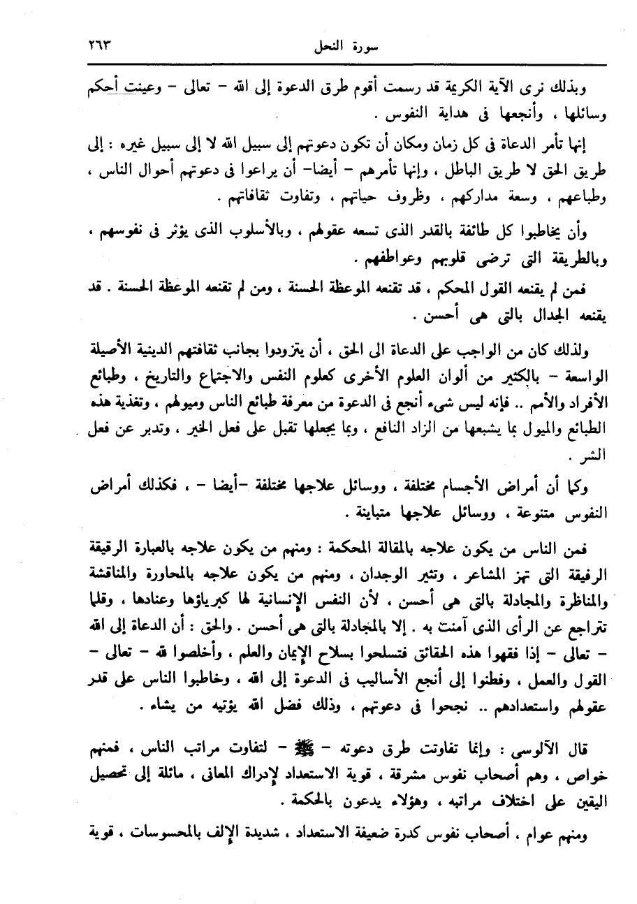 قال الآلوسى: وإنما تفاوتت طرق دعوته صلى الله عليه وسلم لتفاوت مراتب الناس، فمنهم خواص، وهم أصحاب نفوس مشرقة، قوية الاستعداد لإدراك المعاني، مائلة إلى تحصيل اليقين على اختلاف مراتبه، وهؤلاء يدعون بالحكمة.
