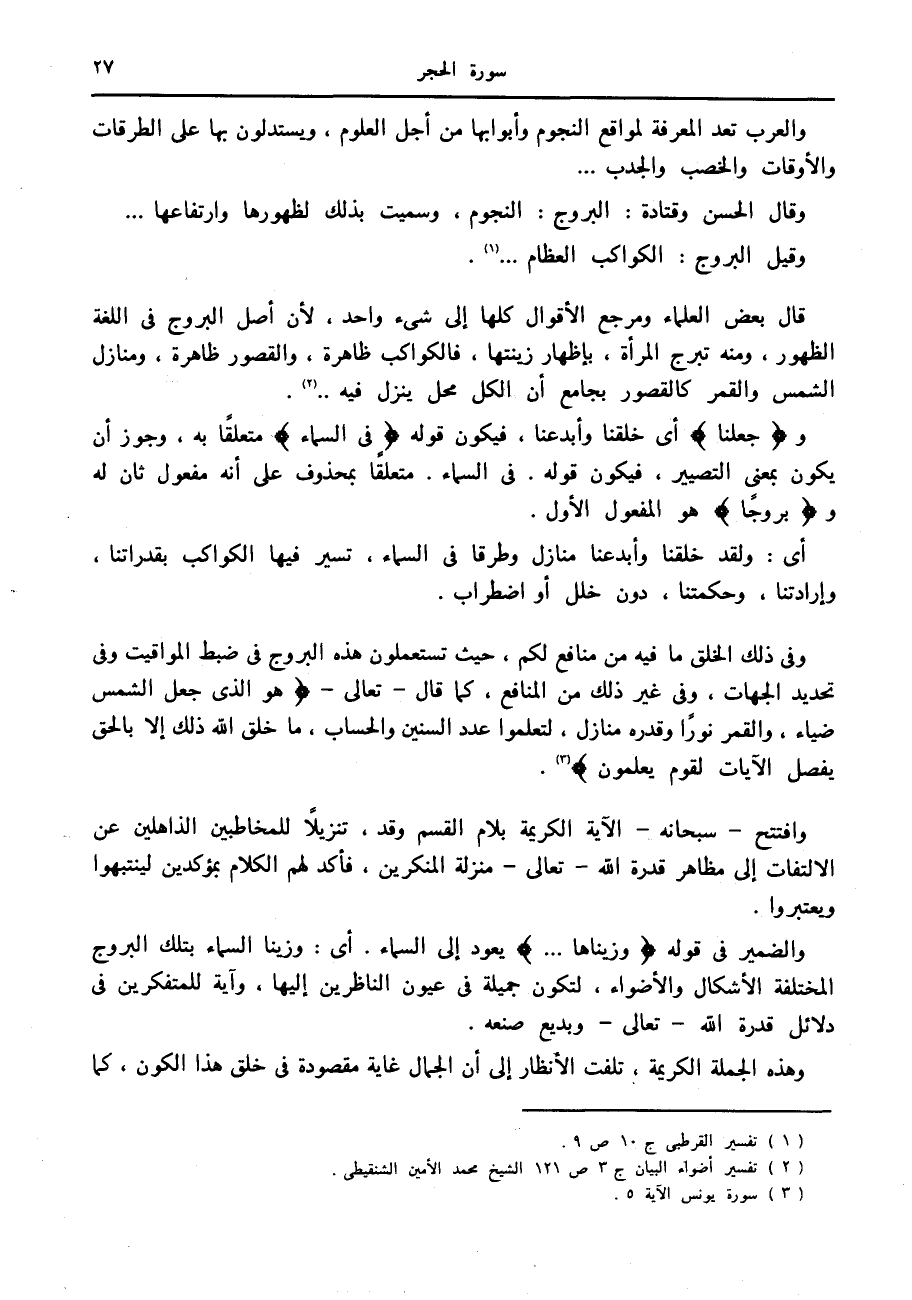 قال بعض العلماء ومرجع الأقوال كلها إلى شيء واحد، لأن أصل البروج في اللغة الظهور، ومنه تبرج المرأة، بإظهار زينتها، فالكواكب ظاهرة، والقصور ظاهرة، ومنازل الشمس والقمر كالقصور بجامع أن الكل محل ينزل فيه.. «2» .