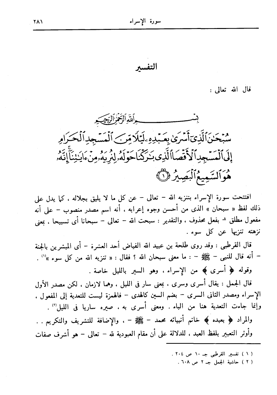 افتتحت سورة الإسراء بتنزيه الله- تعالى- عن كل ما لا يليق بجلاله، كما يدل على ذلك لفظ «سبحان» الذي من أحسن وجوه إعرابه، أنه اسم مصدر منصوب- على أنه مفعول مطلق- بفعل محذوف، والتقدير: سبحت الله- تعالى- سبحانا أى تسبيحا، بمعنى نزهته تنزيها عن كل سوء.