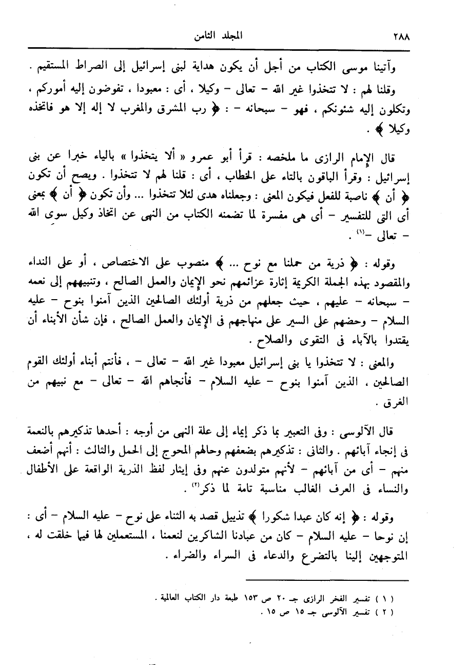 والمعنى: لا تتخذوا يا بنى إسرائيل معبودا غير الله- تعالى-، فأنتم أبناء أولئك القوم الصالحين، الذين آمنوا بنوح- عليه السلام- فأنجاهم الله- تعالى- مع نبيهم من الغرق.