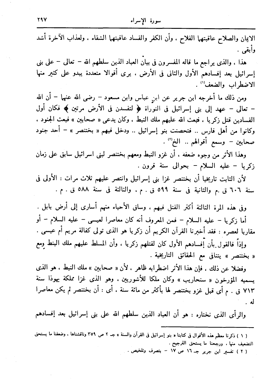 (1) ذكرنا معظم هذه الأقوال في كتابنا «بنو إسرائيل في القرآن والسنة» ج 2 ص 359 وناقشناها، وضعفنا ما يستحق التضعيف منها، ورجحنا ما يستحق الترجيح.