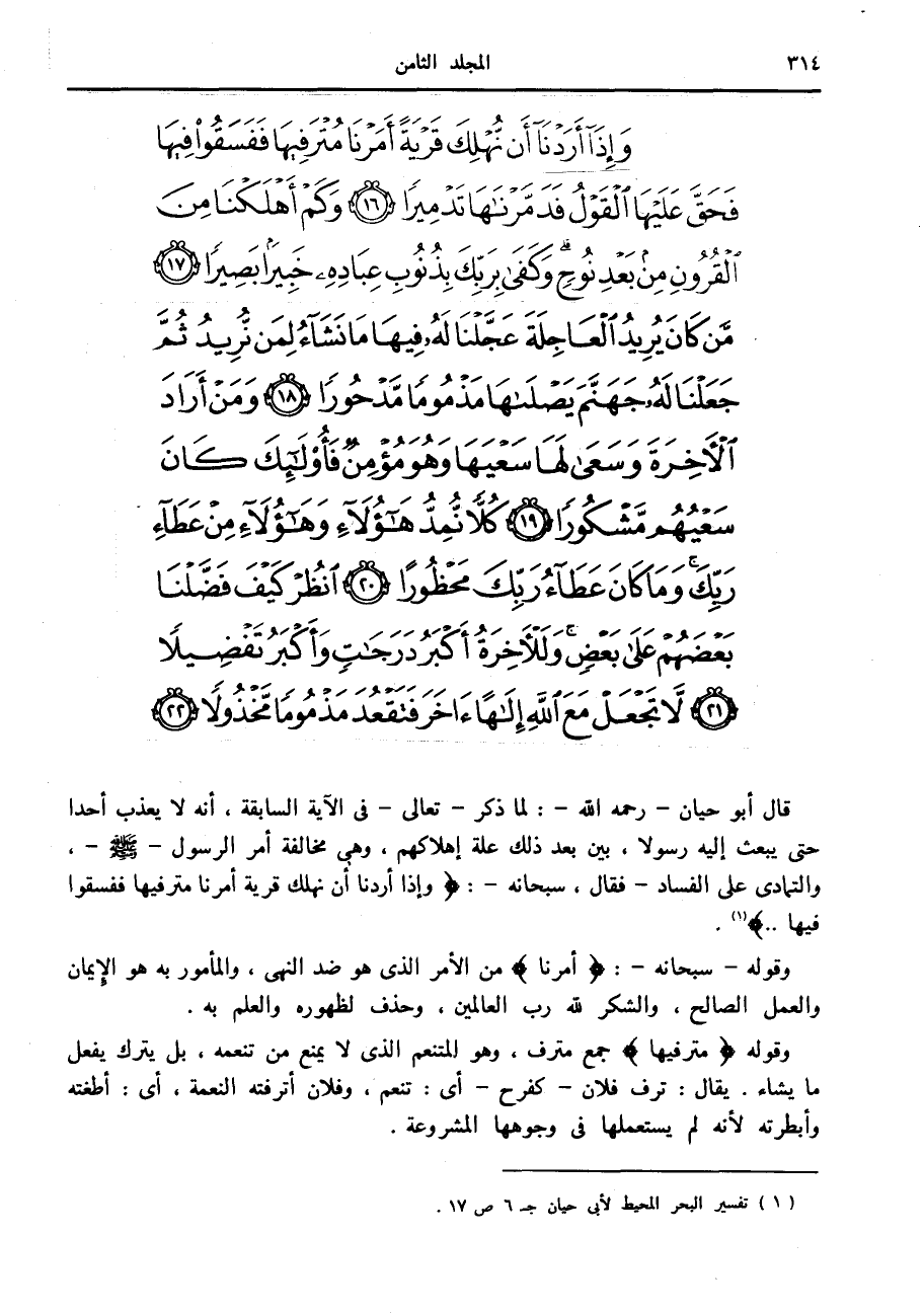 وَإِذا أَرَدْنا أَنْ نُهْلِكَ قَرْيَةً أَمَرْنا مُتْرَفِيها فَفَسَقُوا فِيها فَحَقَّ عَلَيْهَا الْقَوْلُ فَدَمَّرْناها تَدْمِيراً (16) وَكَمْ أَهْلَكْنا مِنَ الْقُرُونِ مِنْ بَعْدِ نُوحٍ وَكَفى بِرَبِّكَ بِذُنُوبِ عِبادِهِ خَبِيراً بَصِيراً (17) مَنْ كانَ يُرِيدُ الْعاجِلَةَ عَجَّلْنا لَهُ فِيها ما نَشاءُ لِمَنْ نُرِيدُ ثُمَّ جَعَلْنا لَهُ جَهَنَّمَ يَصْلاها مَذْمُوماً مَدْحُوراً (18) وَمَنْ أَرادَ الْآخِرَةَ وَسَعى لَها سَعْيَها وَهُوَ مُؤْمِنٌ فَأُولئِكَ كانَ سَعْيُهُمْ مَشْكُوراً (19) كُلاًّ نُمِدُّ هؤُلاءِ وَهَؤُلاءِ مِنْ عَطاءِ رَبِّكَ وَما كانَ عَطاءُ رَبِّكَ مَحْظُوراً (20)