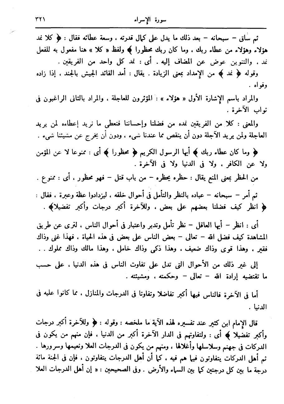 قال الإمام ابن كثير عند تفسيره لهذه الآية ما ملخصه: وقوله: وَلَلْآخِرَةُ أَكْبَرُ دَرَجاتٍ وَأَكْبَرُ تَفْضِيلًا أى: ولتفاوتهم في الدار الآخرة أكبر من الدنيا، فإن منهم من يكون في الدركات في جهنم وسلاسلها وأغلالها، ومنهم من يكون في الدرجات العلا ونعيمها وسرورها.