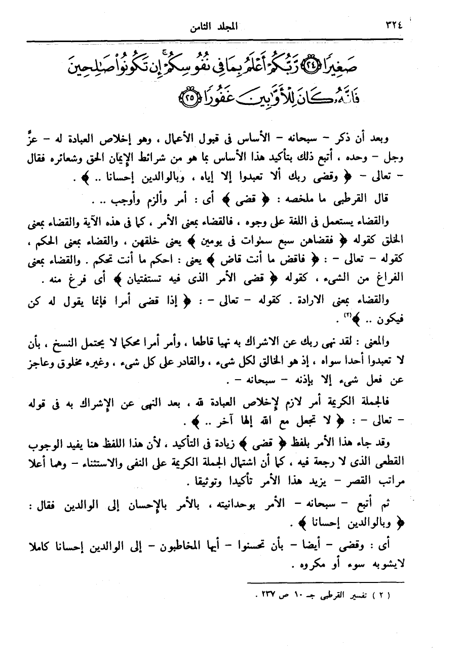 وبعد أن ذكر- سبحانه- الأساس في قبول الأعمال، وهو إخلاص العبادة له- عزّ وجل- وحده، أتبع ذلك بتأكيد هذا الأساس بما هو من شرائط الإيمان الحق وشعائره فقال- تعالى- وَقَضى رَبُّكَ أَلَّا تَعْبُدُوا إِلَّا إِيَّاهُ، وَبِالْوالِدَيْنِ إِحْساناً ...