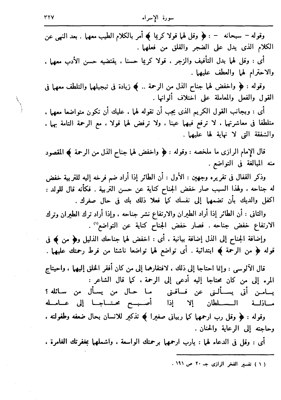 قال الإمام الرازي ما ملخصه: وقوله: وَاخْفِضْ لَهُما جَناحَ الذُّلِّ مِنَ الرَّحْمَةِ المقصود منه المبالغة في التواضع.