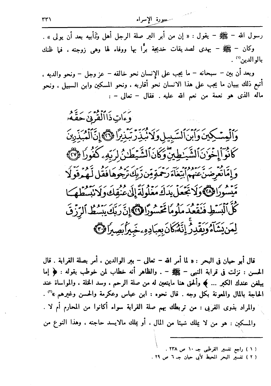 وَآتِ ذَا الْقُرْبى حَقَّهُ وَالْمِسْكِينَ وَابْنَ السَّبِيلِ وَلا تُبَذِّرْ تَبْذِيراً (26) إِنَّ الْمُبَذِّرِينَ كانُوا إِخْوانَ الشَّياطِينِ وَكانَ الشَّيْطانُ لِرَبِّهِ كَفُوراً (27) وَإِمَّا تُعْرِضَنَّ عَنْهُمُ ابْتِغاءَ رَحْمَةٍ مِنْ رَبِّكَ تَرْجُوها فَقُلْ لَهُمْ قَوْلاً مَيْسُوراً (28) وَلا تَجْعَلْ يَدَكَ مَغْلُولَةً إِلى عُنُقِكَ وَلا تَبْسُطْها كُلَّ الْبَسْطِ فَتَقْعُدَ مَلُوماً مَحْسُوراً (29) إِنَّ رَبَّكَ يَبْسُطُ الرِّزْقَ لِمَنْ يَشاءُ وَيَقْدِرُ إِنَّهُ كانَ بِعِبادِهِ خَبِيراً بَصِيراً (30)