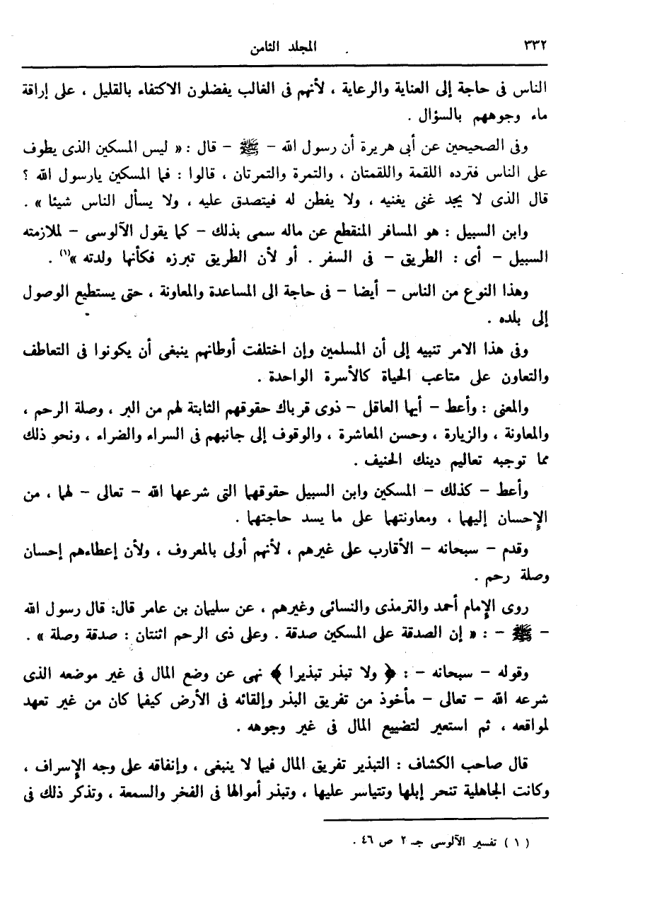وأعط- كذلك- المسكين وابن السبيل حقوقهما التي شرعها الله- تعالى- لهما، من الإحسان إليهما، ومعاونتهما على ما يسد حاجتهما.
