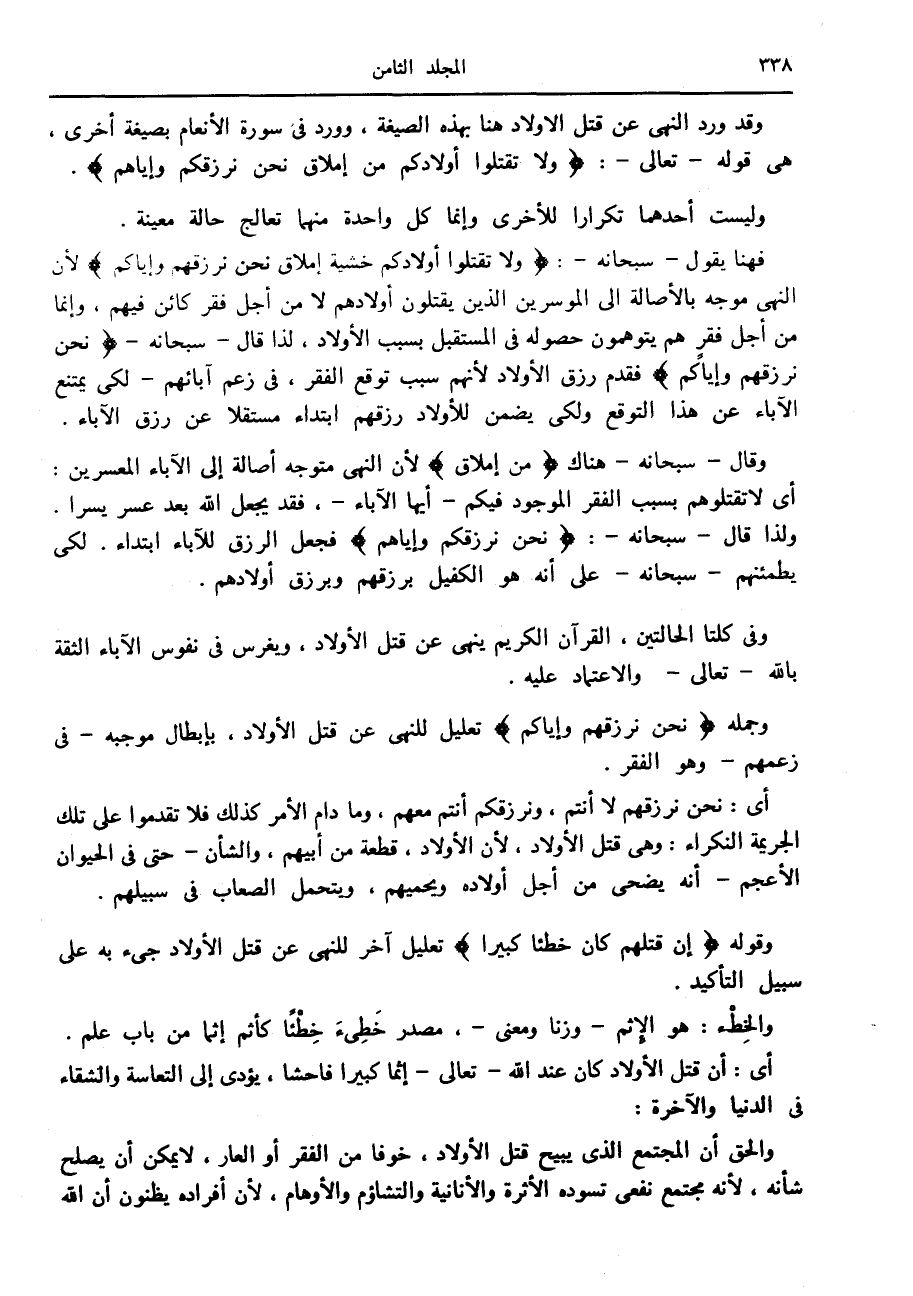 والحق أن المجتمع الذي يبيح قتل الأولاد، خوفا من الفقر أو العار، لا يمكن أن يصلح شأنه، لأنه مجتمع نفعي تسوده الأثرة والأنانية والتشاؤم والأوهام، لأن أفراده يظنون أن الله