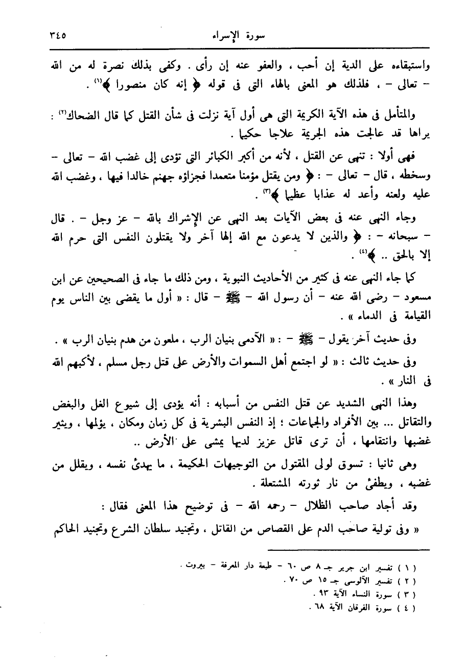 وهذا النهى الشديد عن قتل النفس من أسبابه: أنه يؤدى إلى شيوع الغل والبغض والتقاتل ... بين الأفراد والجماعات إذ النفس البشرية في كل زمان ومكان، يؤلمها، ويثير غضبها وانتقامها، أن ترى قاتل عزيز لديها يمشى على الأرض..