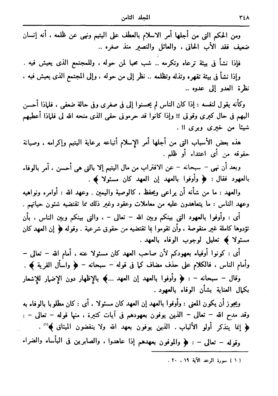 وبعد أن نهى- سبحانه- عن الاقتراب من مال اليتيم إلا بالتي هي أحسن، أمر بالوفاء بالعهود فقال: وَأَوْفُوا بِالْعَهْدِ إِنَّ الْعَهْدَ كانَ مَسْؤُلًا.