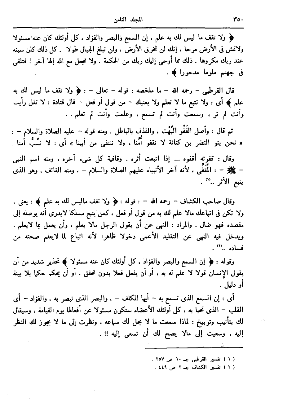 وقال صاحب الكشاف- رحمه الله-: قوله: وَلا تَقْفُ ما لَيْسَ لَكَ بِهِ عِلْمٌ: يعنى، ولا تكن في اتباعك ما لا علم لك به من قول أو فعل، كمن يتبع مسلكا لا يدرى أنه يوصله إلى مقصده فهو ضال. والمراد: النهى عن أن يقول الرجل ما لا يعلم، وأن يعمل بما لا يعلم.