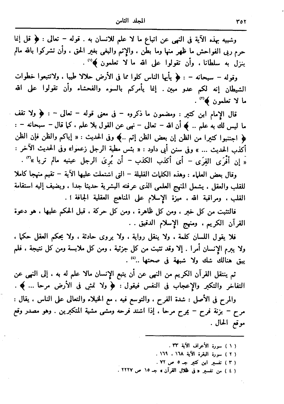 قال الإمام ابن كثير: ومضمون ما ذكروه- في معنى قوله- تعالى-: وَلا تَقْفُ ما لَيْسَ لَكَ بِهِ عِلْمٌ.. أن الله- تعالى- نهى عن القول بلا علم، كما قال- سبحانه-: