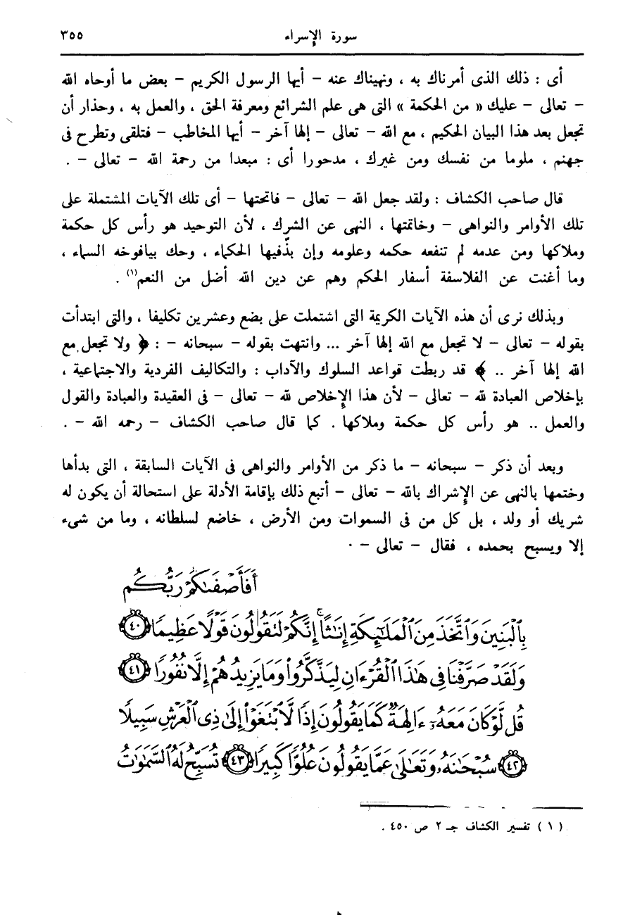 وبذلك نرى أن هذه الآيات الكريمة التي اشتملت على بضع وعشرين تكليفا، والتي ابتدأت بقوله- تعالى- لا تجعل مع الله إلها آخر ... وانتهت بقوله- سبحانه-: وَلا تَجْعَلْ مَعَ اللَّهِ إِلهاً آخَرَ.. قد ربطت قواعد السلوك والآداب: والتكاليف الفردية والاجتماعية، بإخلاص العبادة لله- تعالى- لأن هذا الإخلاص لله- تعالى- في العقيدة والعبادة والقول والعمل.. هو رأس كل حكمة وملاكها. كما قال صاحب الكشاف- رحمه الله-.