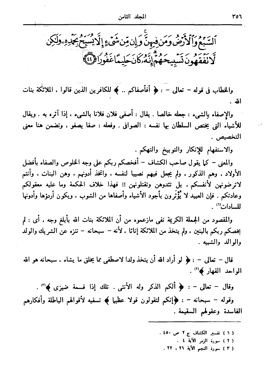والخطاب في قوله- تعالى-: أَفَأَصْفاكُمْ.. للكافرين الذين قالوا، الملائكة بنات الله.