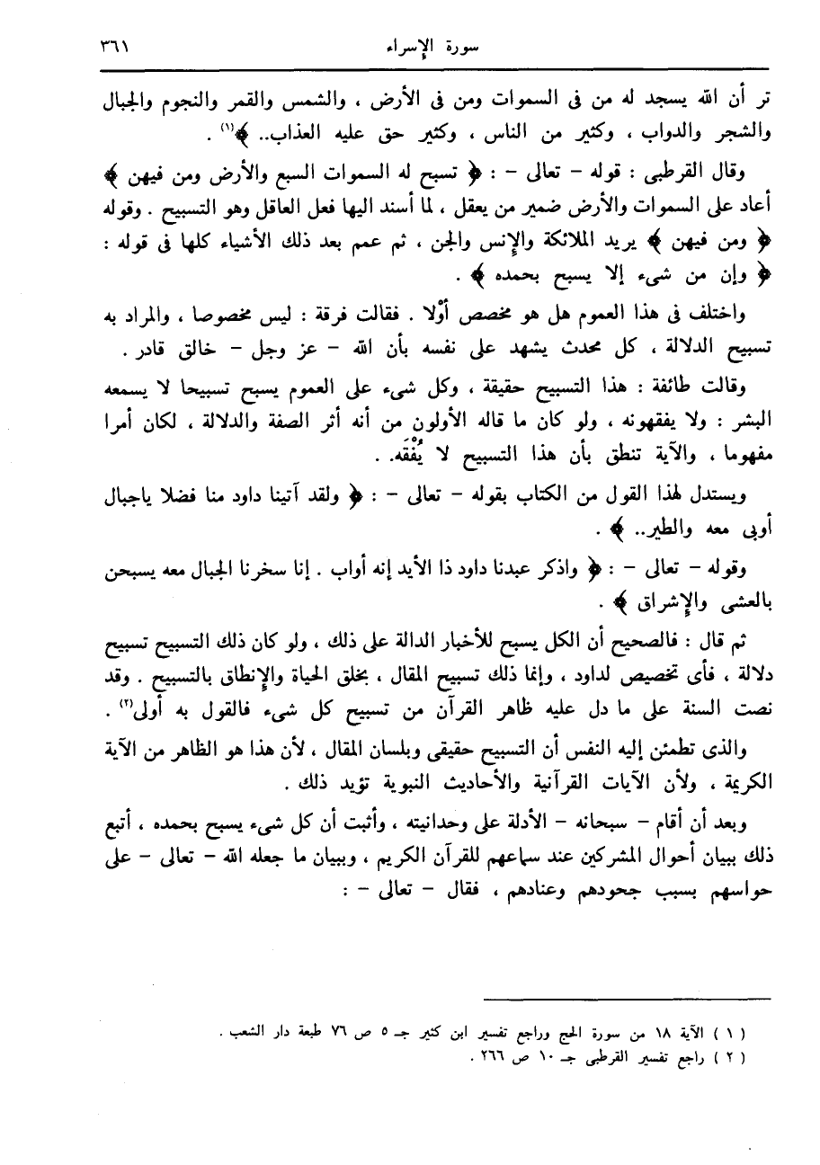 ثم قال: فالصحيح أن الكل يسبح للأخبار الدالة على ذلك، ولو كان ذلك التسبيح تسبيح دلالة، فأى تخصيص لداود، وإنما ذلك تسبيح المقال، بخلق الحياة والإنطاق بالتسبيح. وقد نصت السنة على ما دل عليه ظاهر القرآن من تسبيح كل شيء فالقول به أولى «2» .