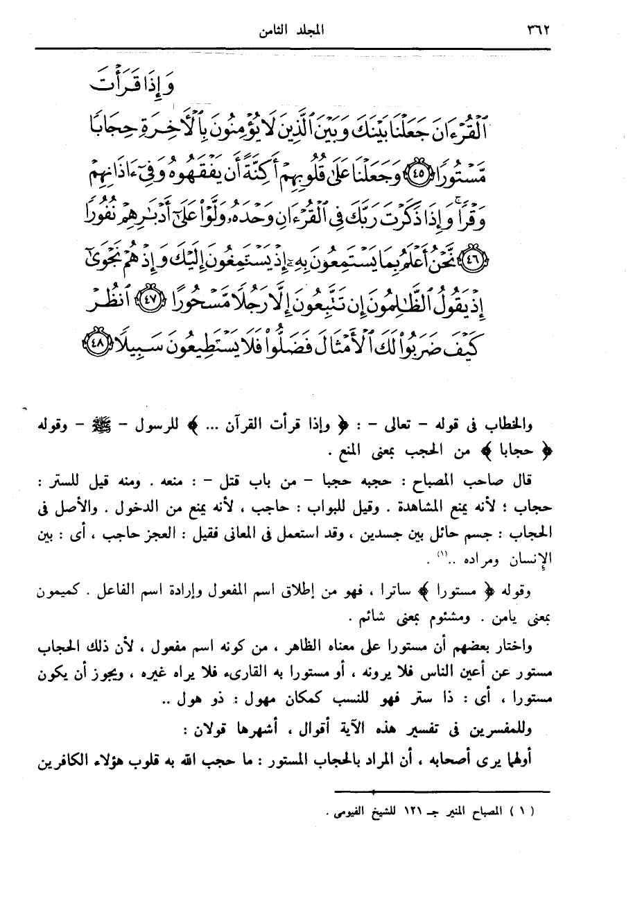 وقوله مَسْتُوراً ساترا، فهو من إطلاق اسم المفعول وإرادة اسم الفاعل. كميمون بمعنى يامن. ومشئوم بمعنى شائم.