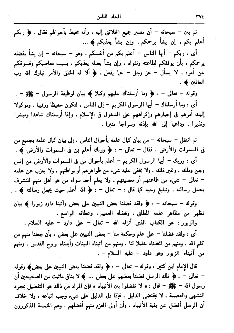 قال الإمام ابن كثير: وقوله- تعالى-: وَلَقَدْ فَضَّلْنا بَعْضَ النَّبِيِّينَ عَلى بَعْضٍ وقوله- تعالى-: تِلْكَ الرُّسُلُ فَضَّلْنا بَعْضَهُمْ عَلى بَعْضٍ ... لا ينافي ما ثبت من الصحيحين أن رسول الله صلى الله عليه وسلم قال: «لا تفضلوا بين الأنبياء» فإن المراد من ذلك هو التفضيل بمجرد التشهى والعصبية، لا بمقتضى الدليل، فإذا دل الدليل على شيء وجب اتباعه، ولا خلاف أن الرسل أفضل عن بقية الأنبياء، وأن أولى العزم منهم أفضلهم، وهم الخمسة المذكورون