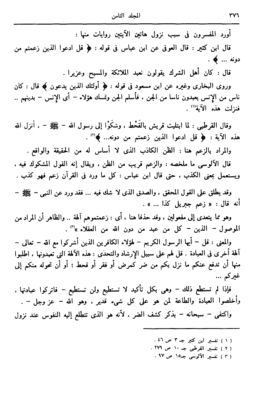 قال ابن كثير: قال العوفى عن ابن عباس في قوله: قُلِ ادْعُوا الَّذِينَ زَعَمْتُمْ مِنْ دُونِهِ....