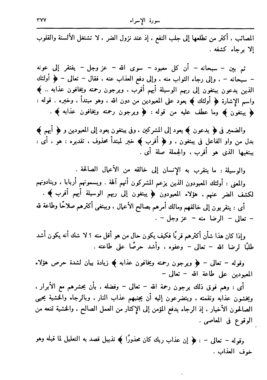 ثم بين- سبحانه- أن كل معبود- سوى الله- عز وجل- يفتقر إلى عونه- سبحانه-، وإلى رجاء الثواب منه، وإلى دفع العذاب عنه، فقال- تعالى- أُولئِكَ الَّذِينَ يَدْعُونَ يَبْتَغُونَ إِلى رَبِّهِمُ الْوَسِيلَةَ أَيُّهُمْ أَقْرَبُ، وَيَرْجُونَ رَحْمَتَهُ وَيَخافُونَ عَذابَهُ..