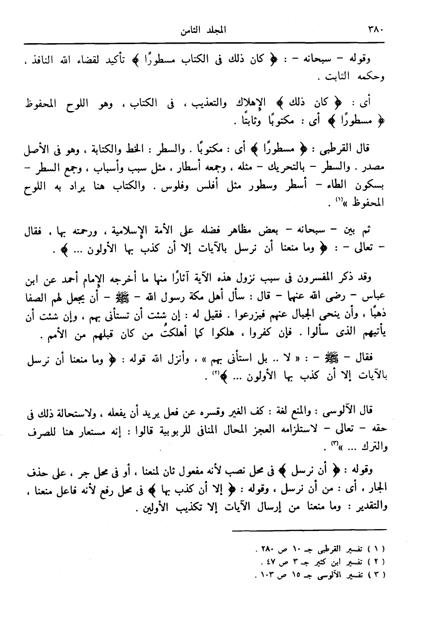 قال القرطبي: مَسْطُوراً أى: مكتوبا. والسطر: الخط والكتابة، وهو في الأصل مصدر. والسطر- بالتحريك- مثله، وجمعه أسطار، مثل سبب وأسباب، وجمع السطر- بسكون الطاء- أسطر وسطور مثل أفلس وفلوس. والكتاب هنا يراد به اللوح المحفوظ» «1» .
